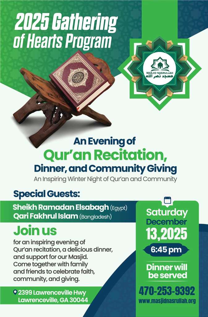 December 13, 2025 @ 6:45 pm - 8:30 pm 2025 Gathering of Hearts Program Join us for the Night of Qur’an Recitation & Community Blessings